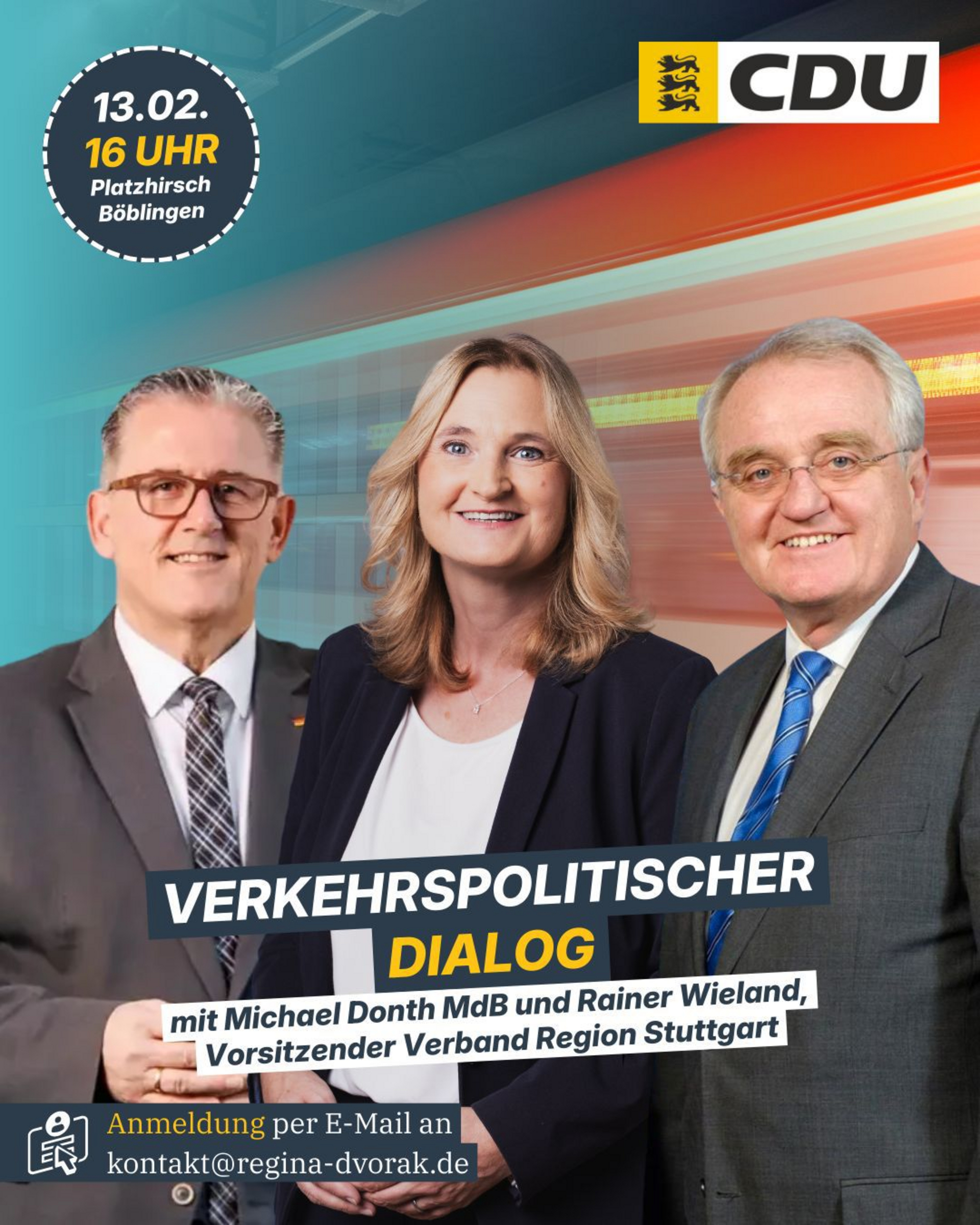 Mobilität ist eine zentrale Zukunftsfrage für unsere Region. Gemeinsam mit Michael Donth MdB und Rainer Wieland, Vorsitzender des Verbands Region Stuttgart, möchten wir über aktuelle verkehrspolitische Herausforderungen und Lösungen für Stadt und Land ins Gespräch kommen.